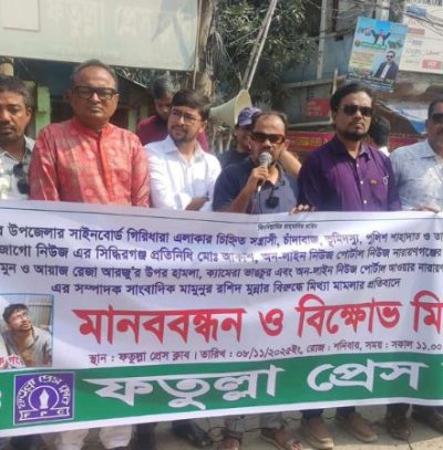নারায়ণগঞ্জ জেলা বিএনপির আহ্বায়ক অধ্যাপক মামুন মাহমুদের বিরুদ্ধে জেলা বিএনপি’র সাবেক ভারপ্রাপ্ত আহ্বায়ক মনিরুল ইসলাম রবির মিথ্যাচারের নিন্দা ও প্রতিবাদ জানিয়েছেন সোনারগাঁ উপজেলা বিএনপির সহ-সভাপতি রফিকুল ইসলাম বিডিআর। রবিকে তাঁর বক্তব্য প্রত্যাহারে দাবি জানিয়েছেন তিনি। অন্যথায় দলীয় বিধিমোতাবেক ব্যবস্থা নেওয়ার কথাও বলেছেন। সোমবার দুপুরে সোনারগাঁয়ে এক সংবাদ সম্মেলনের মাধ্যমে তিনি এই প্রতিবাদ জানান। এসময়ে উপজেলা […]