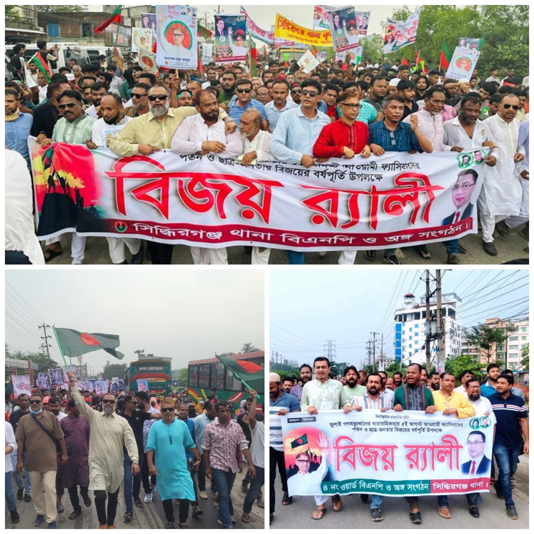 মঙ্গলবার (৫ আগস্ট) বিকালে সিদ্ধিরগঞ্জ পুল থেকে বিজয়ী র্যালি নিয়ে পাইনাদী দশ তালা ভবনের সামনে সংক্ষিপ্ত বক্তব্য দিয়ে শেষ হয়। এরপর সাইনবোর্ড এলাকা থেকে ভূঁইগড় এসবি গার্মেন্টসের সামনে সমাপ্ত হয়। নারায়ণগঞ্জ জেলা বিএনপির আহ্বায়ক অধ্যাপক মামুন মাহমুদের নেতৃত্ব সিদ্ধিরগঞ্জ ও ফতুল্লা থানা বিএনপির ব্যানারে এ র্যালি অনুষ্ঠিত হয়।